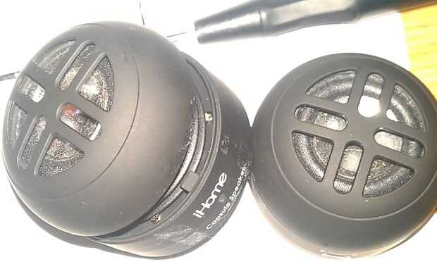Si el altavoz tiene la función de bloqueo de giro (para exponer el agregado "bajo"), desenrosque el altavoz. Inclinar la parte superior del altavoz al lado para exponer los tornillos pequeños. Hay cuatro tornillos a quitar en cada altavoz.