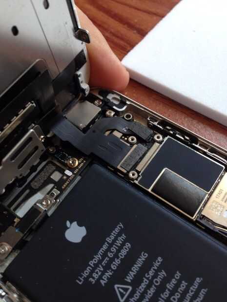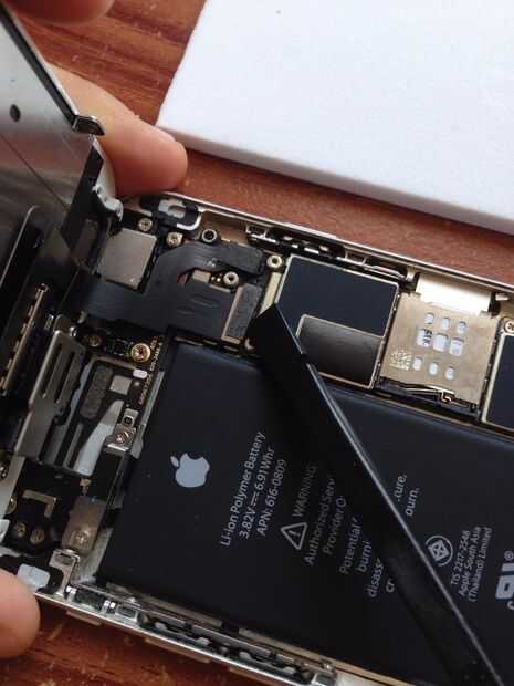 Desconecte el LCD, táctil, sensor de cámara frontal y conectores del botón de inicio con una herramienta de plástico, tal y como se desconecta el conector de la batería en el paso anterior.