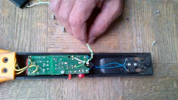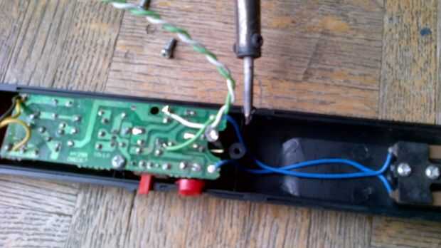 Utilizando el soldador, derretir un poco pequeña del borde de la manija, para hacer un hueco a través del cual se puede encaminar el cable. Esto debe hacerse cuando se utiliza una batería de teléfono celular, ya que no encaja dentro de la manija. Si utiliza pilas AA, no hay necesidad de esto. Tenga en cuenta que deben evitar respirar los humos de la fundición del plástico. Hacerlo en un área bien ventilada.