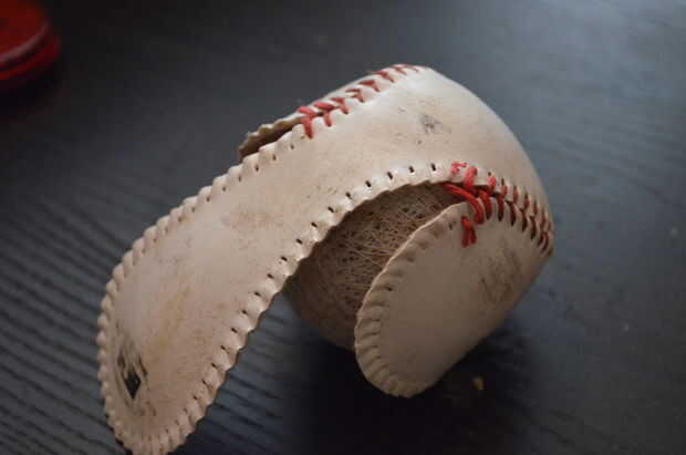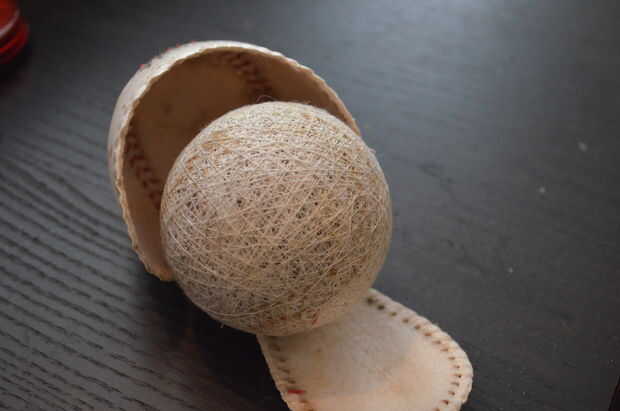 No tenía ninguna necesidad de empezar de cero ya que los interiores estaban bien, pero la cáscara de cuero en esta bola había visto mejores días. Me sacó la navaja confianza y comencé a abrirla hasta un poco más hasta que pude quitar la base de la piel.