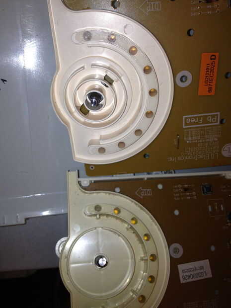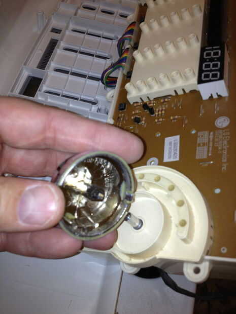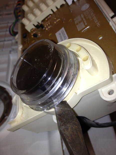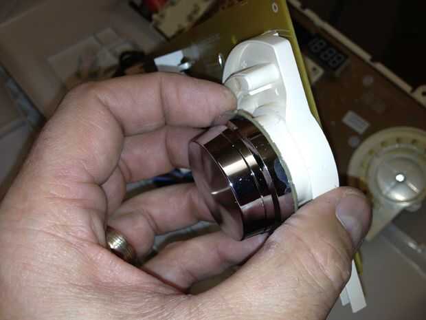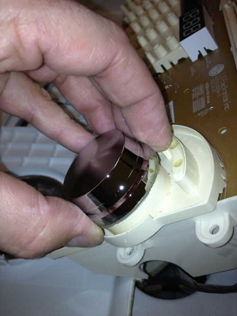 La perilla de control es necesario para el tablero de repuesto (a menos que usted ordene uno con él). Se compone de dos partes: una cubierta externa transparente y el botón de plata sí mismo. Mientras que es posible tirar de la tapa y el botón de apagado en una sola pieza, me encontré con que no llevaría. Quité la carcasa apalancando. El interior botón fue entonces capaz de ser extraído es huso.