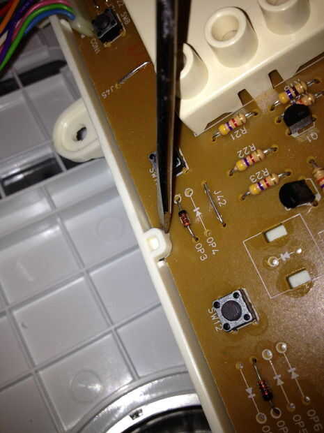 La tarjeta de interfaz de usuario se lleva a cabo en la caja de clips a lo largo de un lado, y preformados de pequeños soportes a lo largo del otro lado. Los soportes no son flexibles, y usted no debe intentar quitar el tablero a lo largo de ese borde. Más bien apretar los clips con un par de alicates de punta larga (o su elección de arma) pero no exprimirlo demasiado lejos o en otro lugar que los clips se romperán. Apreté cada uno de los tres clips justo más allá del borde del tablero y luego utiliza el extremo de un destornillador plano para sacar el tablero para arriba y lejos de los clips.