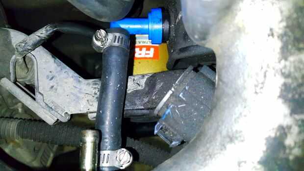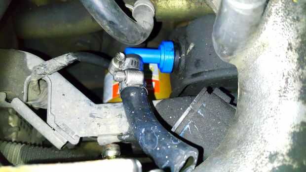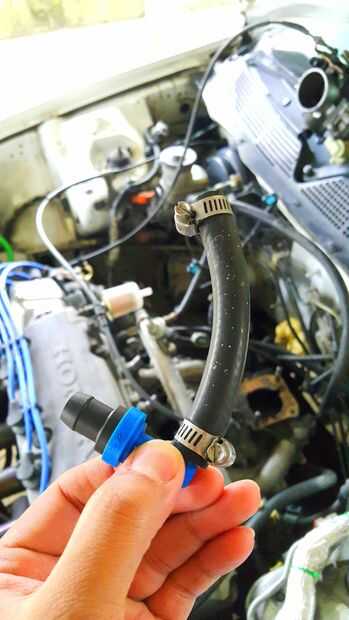 Aparejado a una nueva manguera y abrazaderas para la nueva válvula de pcv. Tuve que quitar el soporte del cable de acelerador para darme más espacio de trabajo. Insertar cuidadosamente el pcv en el puerto de motor, conectar la manguera al múltiple.