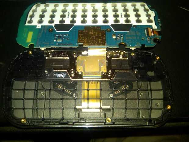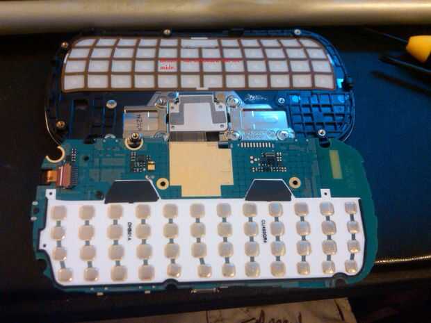 9. ok ahora Deslice con cuidado el teléfono como si se estaba abriendo el teléfono para acceder al teclado. Verá 4 tornillos negro. Usted accederá a 2 de ellos a través de la red negro donde estaba sentado el teclado. Desatornille los 4 tornillos negros y apartar con teclado.