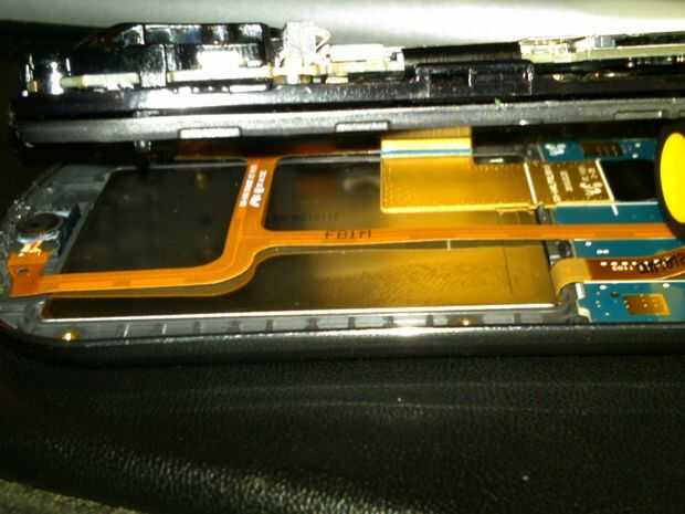 14. en mi foto puedes ver la pantalla lcd trasera, el altavoz con cinta cable y lado botones. Si usted resbala el teléfono en la posición abierta se puede doblar la parte superior que tiene la placa base sobre fuera del camino. No doble los cables de cinta que se ve. Hay uno color oro más grande que es para el teclado numérico. Estos cables de cinta deben ser levantados suavemente lejos de la parte posterior de la pantalla lcd. Trate de no tirar de ellos a levantar.