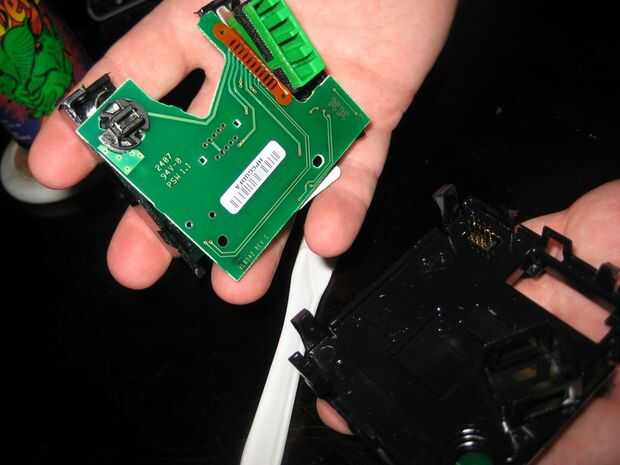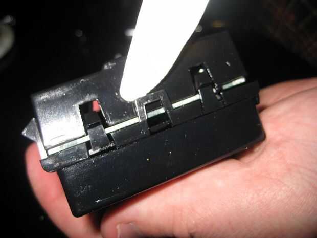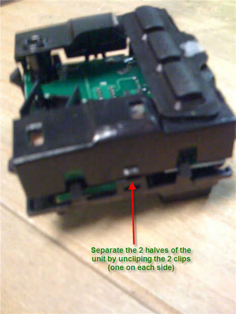 Con la cubierta quitada se pueden separar las 2 mitades de la unidad. Haga palanca en las 2 pestañas, una a cada lado y separar cuidadosamente las 2 mitades. Tenga cuidado de no doblar los pines que es parte de la mitad superior de la unidad. Estos pasadores atraviesan la placa de circuito y conectan a un enchufe en el otro lado.