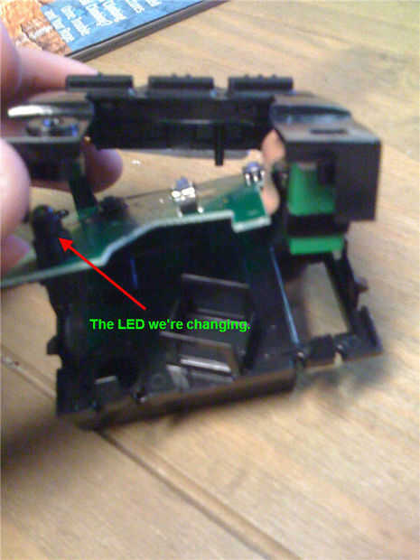 Ahora se puede quitar la placa de circuito de la unidad. No totalmente quitarlo como el conector verde se une con pegamento. Simplemente moverla lo suficiente para dar acceso a la parte posterior del LED nos estamos quitando.