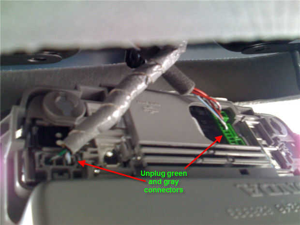 Una vez que la consola se cae desde el techo hay dos cables para desconectar. Desconecte los conectores verdes y gris y la unidad puede ser llevada a un área de trabajo despejada.