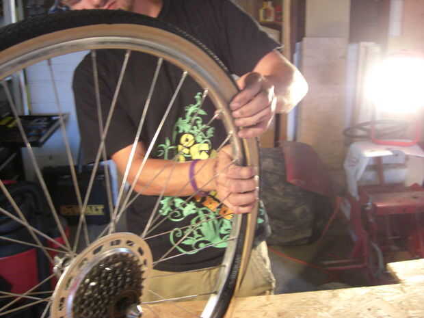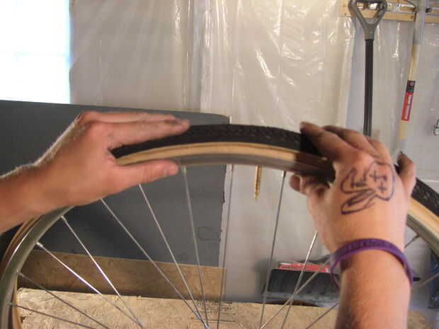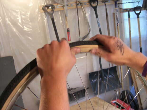 5. Presione el lado del neumático en la llanta. Asegúrese de que también están poniendo el tubo entre los dos lados de la llanta.