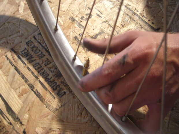 4. Empuje el vástago de la válvula en el orificio de la llanta. Esto es donde le empiezas a poner el neumático.