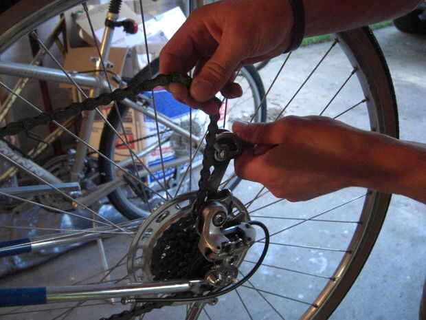 3. enganche la cadena hacia el derailer. Igual que al sacar el neumático, la cadena envuelve alrededor del piñón primero luego los engranajes más pequeños dos de derailer y tensor. Tire al tensor por lo que eres capaz de lazo de la cadena.