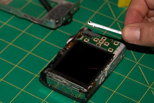 Lamentablemente no tengo una foto de cuando me quitan la retroiluminación de la pantalla. Para ello, hay un marco de metal que los clips en el panel LCD. Esto se lleva a cabo por las pestañas en la parte superior, inferior y lados. Para quitar, utiliza una cuchilla X-acto para liberar la parte superior y derecha clips y la quitó. Después de que el marco está apagado, la pantalla LCD puede eliminarse.
