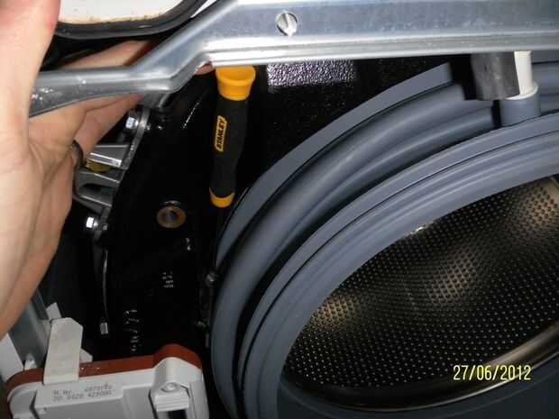 Deshacer el tornillo en el tambor del anillo de retención. Es complicado llegar. Retire la manguera de goma en la parte superior del sello y sacar el sello.