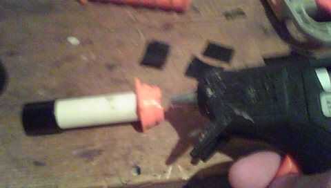 Calor hasta la pistola de pegamento caliente y coloque el tubo CPVC en la tapa anaranjada. Asegúrese de que el cañón es empujado hacia adentro completamente antes de pegar en o no tienes un sello de aire! Retire todo exceso de pegamento una vez que se ha secado y se ha asegurado.