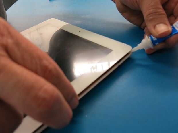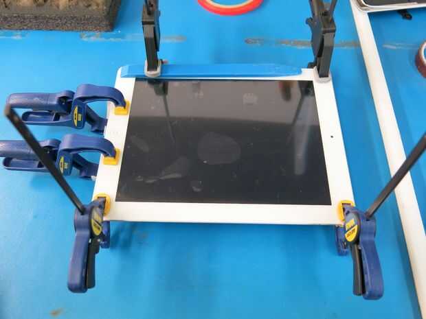2. Coloque digitalizador y aplicar pegamento a cada esquina, así como las áreas donde no se aplicó la cinta.