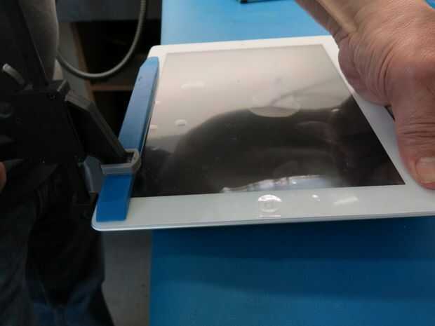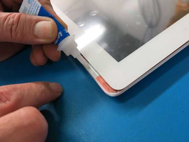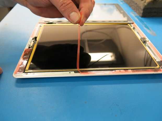 3. ajustar los bordes de su unidad. Utilice la herramienta de palanca plástica como una cuña para aplique presión uniforme para el digitalizador. Asegúrese de sujetar cada esquina donde se aplicó pegamento.