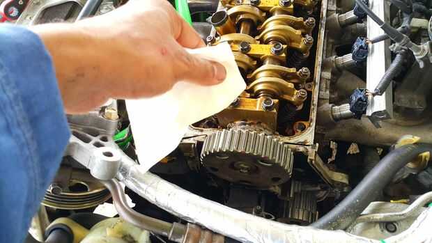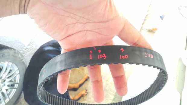Usé alcohol de frotar para limpiar las poleas y bomba de agua. Gracias a las marcas que hice en la correa original, lo pongo en exactamente como era. Apliqué la tensión correcta y cerrar nuevamente el motor. Como se puede ver hace marcas en el exterior de la correa al contar los dientes así como la medición de la anchura (24mm).