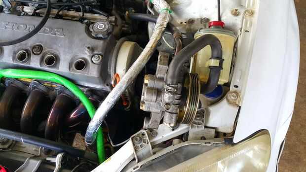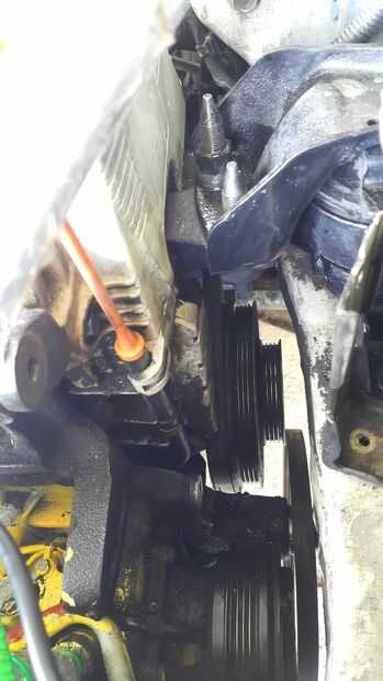 La correa de bomba de dirección asistida, aire acondicionado y alternador todo salió. Con los apropiados y llaves estas 3 bandas eran fáciles de quitar. Conservé la cinta PS cerca de la bomba y la correa del alternador cerca de él para evitar mezclar los cinturones. Necesitaba ir en el coche para la correa del alternador. La banda de AC está cautivo por el soporte de motor delantero izquierdo inferior.