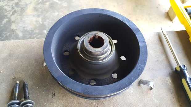 Me quité el perno de la polea fácilmente usando la herramienta de soporte de la polea y mi barra de interruptor automático de 3/4 de pulgada con el zócalo de la extensión y 17mm. Para bajar la polea me sostuvo con ambas manos y movió apagado. Me aseguré de recuperar y mantener la tecla de woodruff.