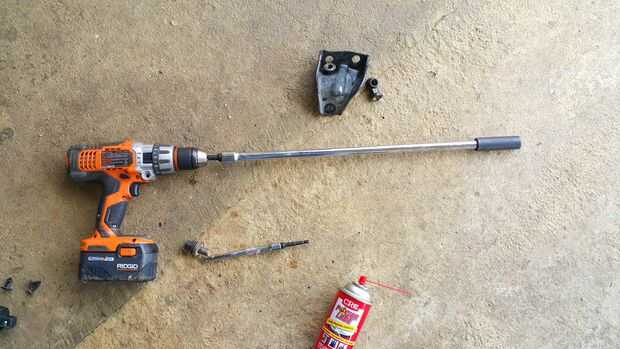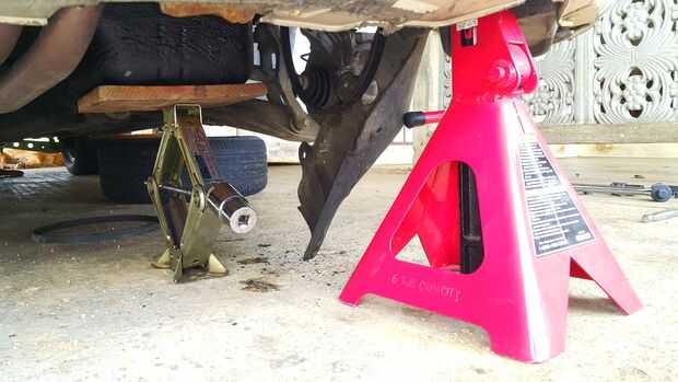 Usé a mi gato del coche con un pedazo de madera para apoyar el recipiente colector de aceite del aceite levantando 1 pulgada. Quité el soporte de montaje del motor.