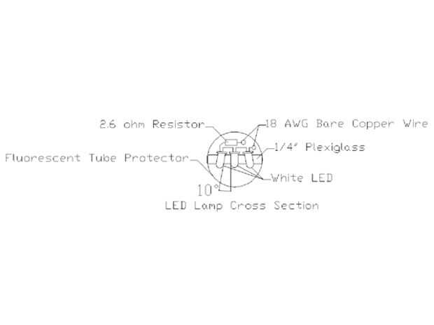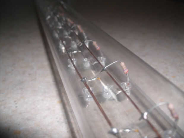 Tomar algunos 18 AWG de cobre y ser soldar en su lugar a lo largo de los lados de los LEDs. Deje aproximadamente 4 pulgadas de alambre extra en cada extremo para trabajar con el final. Suponiendo que usted está comenzando con el carril positivo, mantenga el alambre de cobre contra el plomo de los LED sólo ligeramente por encima de la zona aplanada. Esta área aplanada es un pequeño "aviso" que soldar por debajo de ella puede dañar el LED, así que prueba y alojarte por encima de él. Ahora que el cobre se lleva a cabo contra este lugar, doblar el cable sobre el alambre de cobre y soldadura. Si usted es edificio el LED Modelo 87, repita este proceso 29 veces hasta todos los tríos de LED tienen un lazo en el riel de alimentación. Repita este proceso para las resistencias. Las resistencias no tienen una "marca de seguridad", así que trate y se mantengan por lo menos 1/4 pulgada lejos de la resistencia al soldar. Usted notará un ángulo de 10 grados en los LEDs en esta sección. Este es un diseño ideal que podría hacer sin un difusor de la lámpara. Sin embargo, este ángulo no es un requisito. Es difícil de perforar ángulos precisos en el plexiglás. En los focos que fueron construidos, el ángulo fue omitido y los agujeros fueron perforados simplemente directo.
