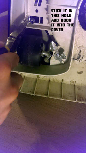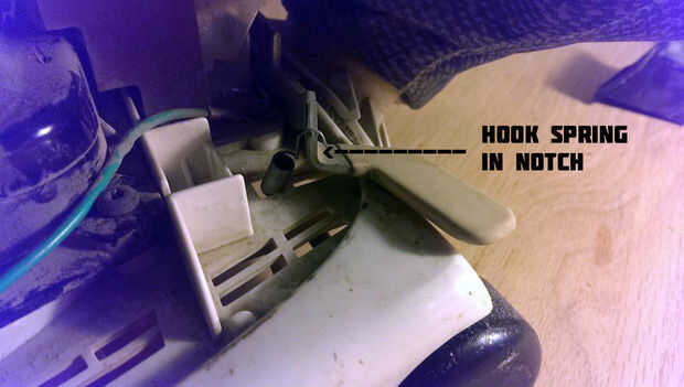 Con pinzas, tire el resorte en la parte inferior y conectarlo en el plástico para mantener tenso el pedal.