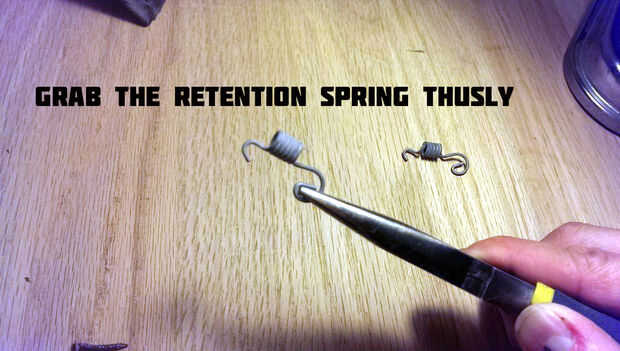 Con los alicates alrededor de la porción Arabesc del resorte de retención, el extremo curvo se equivocan en el espacio y coger la muesca del metal de la tapa antes de tirar el final Arabesc en la muesca de plástico.