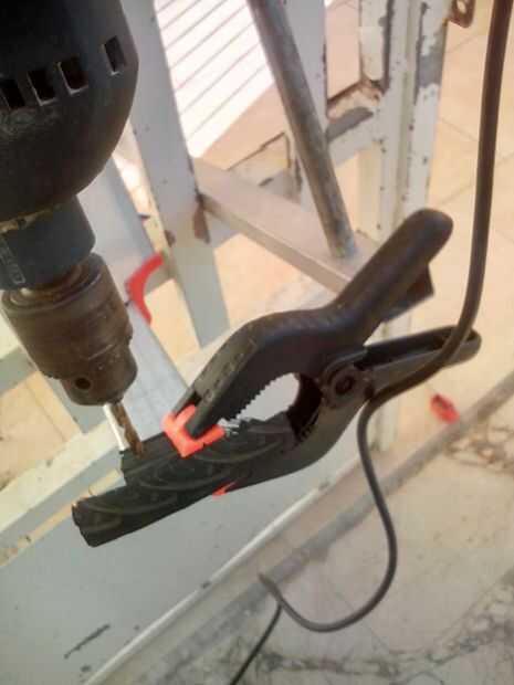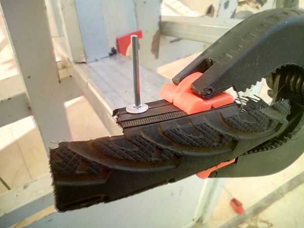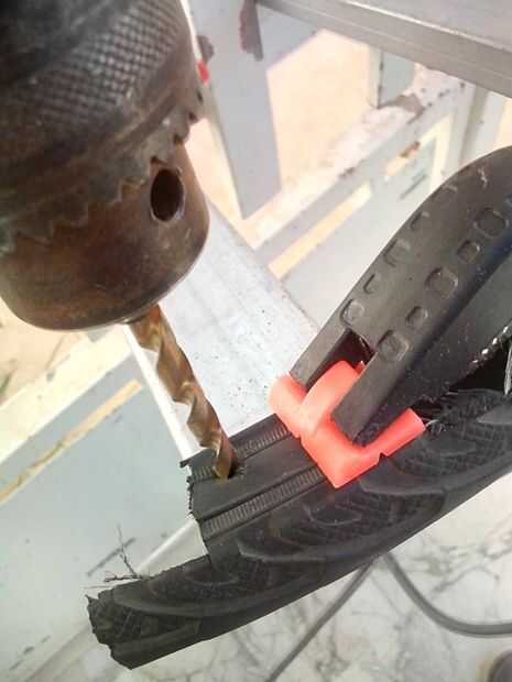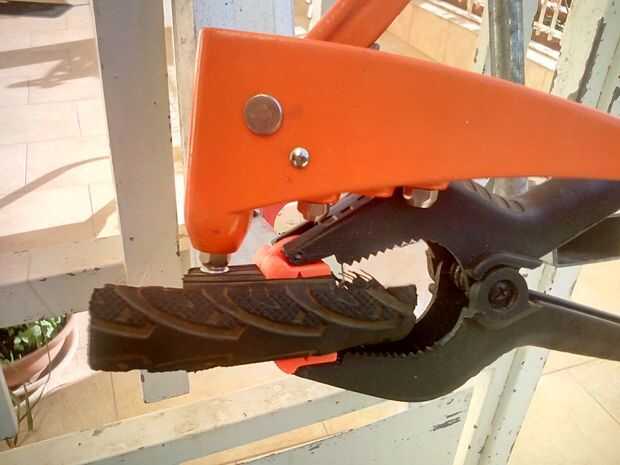 fissare il pezzo stampato alla base delle escala e tenerlo con il morsetto e foratura con il trapano, applicare il rivetto con la rivettatrice. Ripetere il processo por ogni lato di tutte le gambe della scaletta