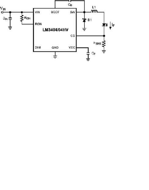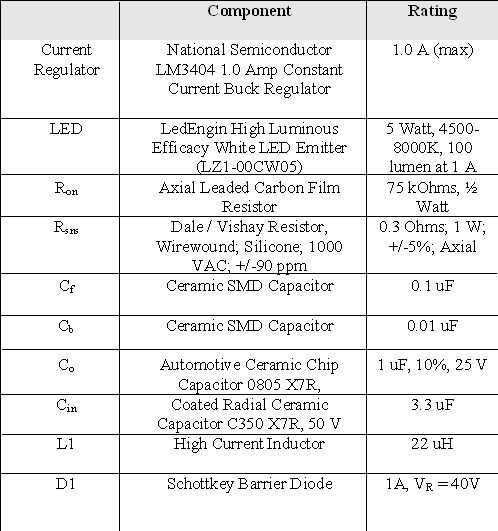 El National Semiconductor LM3404 1.0 Amp Buck regulador de corriente constante se utiliza como el dispositivo de regulación actual. Un conjunto detallado de instrucciones puede encontrarse en la hoja de datos para este dispositivo. Siguiendo estas instrucciones, el diseñador del circuito puede determinar las calificaciones de los componentes externos necesarios para satisfacer sus necesidades.