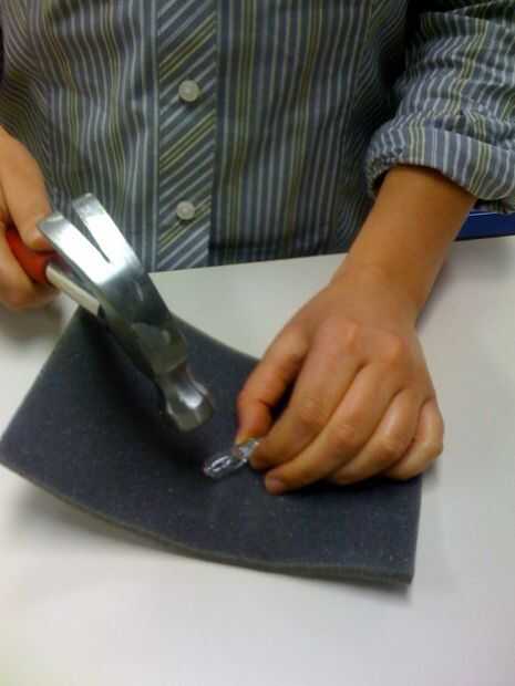 Colocar la bombilla rota en la bolsa de plástico (incluida) y sujete la bombilla desde el exterior en la base. Tenga cuidado de no cortarse con el vidrio o golpear los dedos con el martillo. Golpee la parte superior de la bombilla rota lámpara quirúrgica con un pequeño martillo. Tenga cuidado de no golpear el bulbo con demasiada fuerza. El objetivo es quitar el cristal y exponer los contactos que originalmente había conectado el filamento roto con el resto del bulbo.