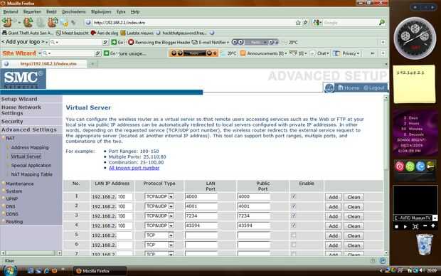 Ahora en su módem / menú principal del router, vaya a configuración avanzada -> NAT -> Virtual Server. Una vez allí, verá una lista de casillas vacías (en la imagen que algunos han sido llenados, ya que lo hice antes). Ahora, en la primera cajita vacía, puso los tres últimos números de la dirección IPv4. Así: Si la dirección IPv4 es 192.168.2.100, pones 100 en esa caja. Luego, en el cuadro de lista desplegable, seleccione TCP y UDP. En los cuadros de entrada puerto público y puerto LAN, escriba el puerto que necesita para ser aceptado (en el ultimo paso que proporcionó algunos puertos utilizados por cosas comunes). Ahora selecciona la casilla de verificación Habilitar y haga clic en Agregar.