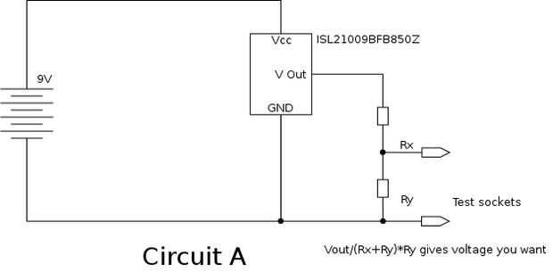 Como el rango más bajo de mi medidor es 200mV, (que será realmente solo lee hasta 199.9mV) y no veo ninguna referencias ofreciendo bajo salida de 200mV, división llegó a ser necesaria, por lo que terminó con el circuito A.