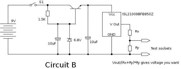 En esta versión, se agrega la regulación por la combinación de transistor y Diodo zener (en lugar de sólo una simple zener y la resistencia, ya que este arreglo permite una mayor variación en la corriente de drenaje). La fuente (Vcc) a la viruta de referencia es ahora un if bastante estable aproximado de 6.2V. Los condensadores son para reducir el ruido.
