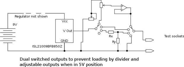Se ha añadido un interruptor a la salida para hacer la referencia un poco más versátil. Darse cuenta de el interruptor podría afectar la salida agregando un poquito de resistencia de contacto, o ruido, pero para calibrar un medidor de 3,5 dígitos, y cualquier otra cosa estoy propensos a usar para en el momento, no creo que esto era importante.