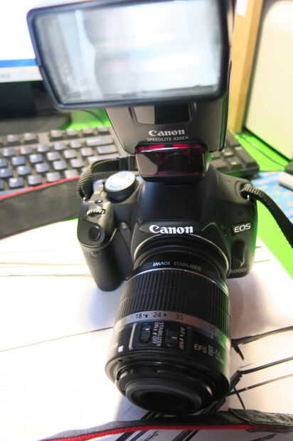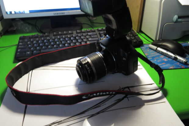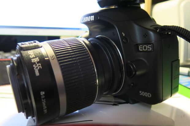 1. canon 500d, 18-55mm kit lente inversa montado y Canon Speedlight Flash.
