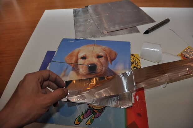 Empezar cubriendo cada pedazo de cinta de aluminio. Es muy pegajosa, recomiendo trabajar en una mejor superficie de la mesa. No quieres ir crumply ya que esto reducirá la reflexión radar...