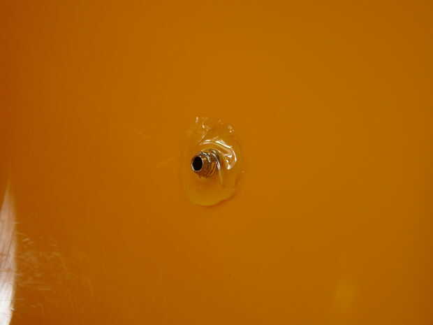 - Gire la válvula de fuera en el agujero y sellarla de dentro con caliente-derrite el pegamento.
