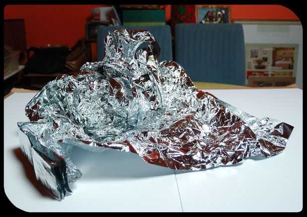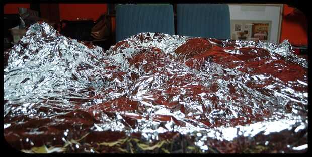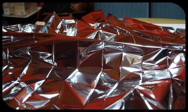 Abrir la manta de la emergencia y arruga para arriba repite para eliminar las arrugas y crear un montón de pequeñas arrugas. Esto es para evitar puntos calientes, o tan los otros Instructables me dicen :)