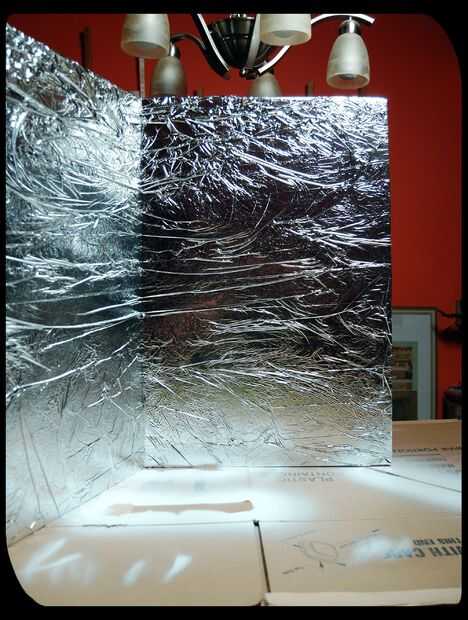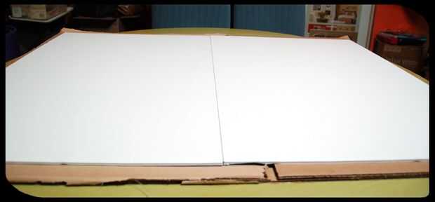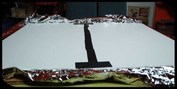 Tome el reflector blanco suave utilizado en el paso anterior y colóquela plana para que la bisagra de la cinta hacia abajo. Asegúrese de cubrir la superficie de trabajo con cartulina vieja u otro material desechable. El pegamento de spray es fuerte y difícil de conseguir fuera de las superficies sin disolvente... que probablemente tomaría el acabado justo al lado de cualquier mesa de comedor o cocina.