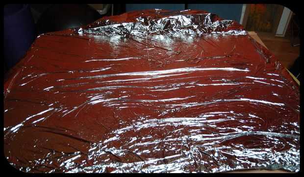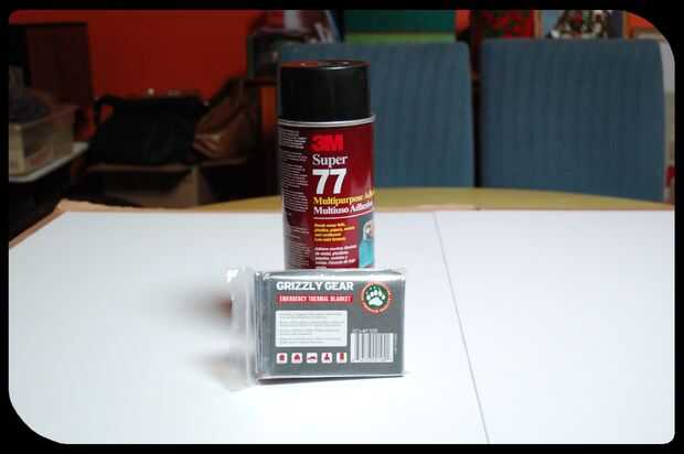 3 M Super 77 generosamente en el op del tablero de la espuma del aerosol. Deje durante 15-30 segundos... en este punto el adhesivo es hortera, pero todavía puede ajustar lo que adhieren a ella. Coloque la manta en la parte superior del tablero de la espuma y presione hacia abajo, trabajando de un lado a otro. No te preocupes las arrugas o pliegues, deben trabajar a nuestro favor. Una vez que la manta está adherida a la Junta de espuma, voltee la placa y corte cualquier exceso manta, dejando un borde de 3-4". Doblar este borde sobre el respaldo de la Junta Directiva y la cinta por los bordes con cinta de adhesiva. No queremos dejar los bordes sueltos para engancharse en el equipo o las luces cuando esté en uso.