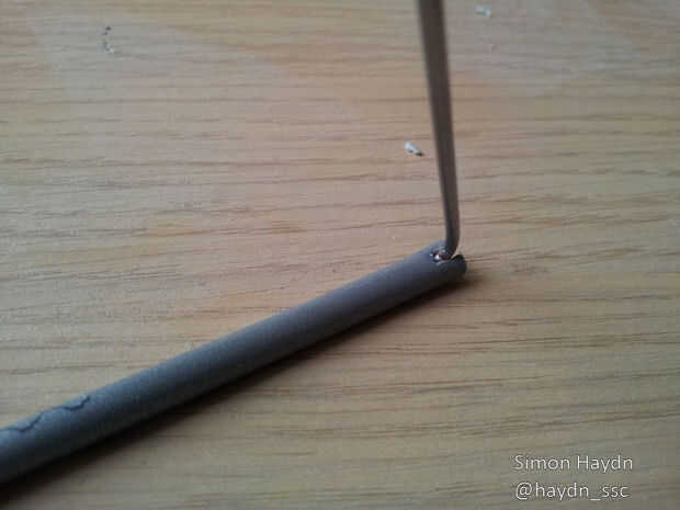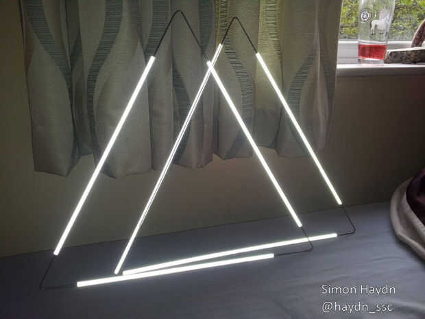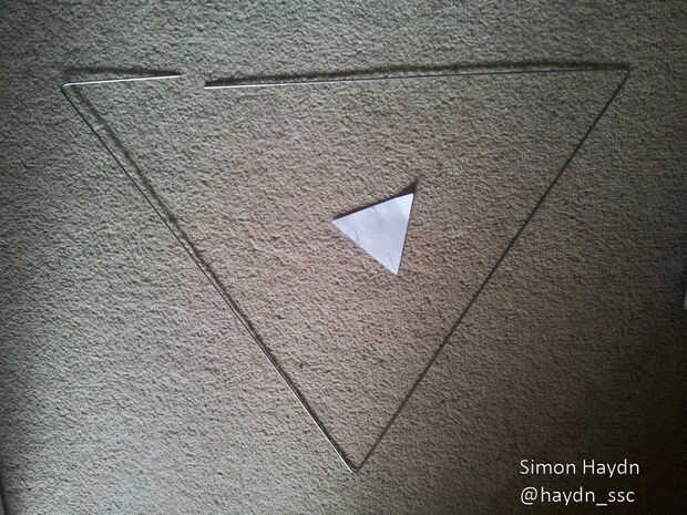 Corte el acero inoxidable a una longitud de 1.5m para cada reflector triángulo listo para doblar. Con el primer doblez que necesita para asegurarse de que la Junta cae cerca del centro de un reflector de habla, de lo contrario el triángulo flexionará demasiado cuando usted unirse a él para arriba. He utilizado una plantilla de triángulo de papel para hacer la forma, pero para ser honesto es más fácil que hacerlo a ojo.
