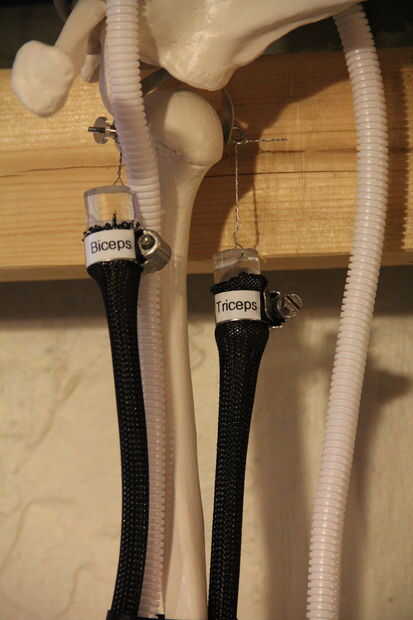 Actuadores neumáticos primero fueron desarrollados en la década de 1950 para ayudar a las víctimas de la poliomielitis que habían perdido el control de un miembro. Estos actuadores han conseguido popular recientemente en el campo de robótica y mecatrónica. Un gran Instructable ya existe que detalla exactamente cómo crear estos músculos, que he seguido para construir los músculos bíceps y tríceps. El brazo esquelético que compré tenía alambre de montaje de puntos para los músculos en la parte superior y parte inferior, si hacen tu propio tendría que agregar ganchos o algo similar para el montaje de los músculos.