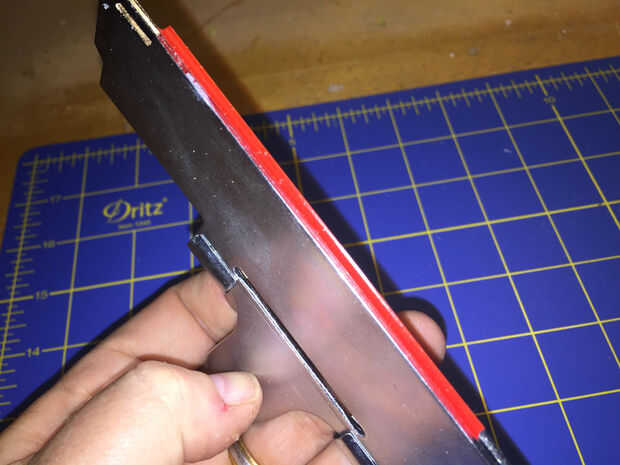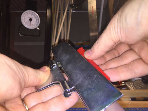 Una vez que la flecha se colocar en la plantilla, tomar la pinza de pluma y abrirlo como haría un broche aprietapapel grande. Coloque una paleta en el clip de modo que su extremo posterior se alinea con la muesca en la abrazadera. Esta manera obtendrás la colocación coherente de tus paletas. Empuje la paleta en la abrazadera completamente hasta justo el borde inferior está por encima de la abrazadera. Esto es donde aplicas el pegamento.