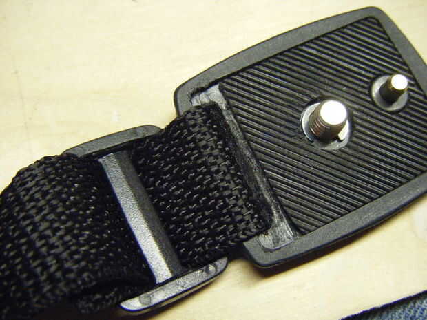 alimentar la correa a través de su zapato de trípode y lazo a través y a través de la barra deslizante que le enseñó. Asegúrese de que usted bucle por el lado plano de la botella por lo que se encuentra al ras con la parte inferior de la cámara.