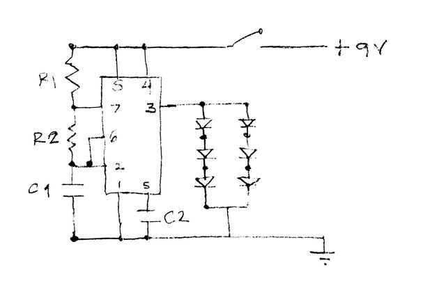 Construir el circuito según el esquema. No agregue el LED o cambiar a la Junta. Iremos añadiendo los más tarde sus propios tableros. Fije el clip de la batería de 9v para el tablero con pegamento caliente.