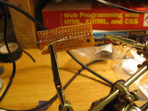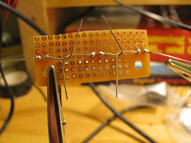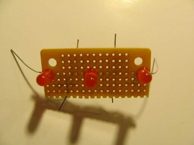 De la soldadura de 3 LED en serie espaciados uniformemente a través de la pequeña perfboard. Asegúrese de que Compruebe la polaridad - la pata larga es positiva. Les de la soldadura en sus orificios, trence los cables y soldarlos. Dejar las piernas en la parte exterior untrimmed y marcan los lados de la polaridad. Si se olvida de qué lado es positivo, los cables en el exterior de la curva y toque a una batería de 9v. Si se enciende, han hecho un buen trabajo. Marca los lados positivos. Hacer dos de estos.