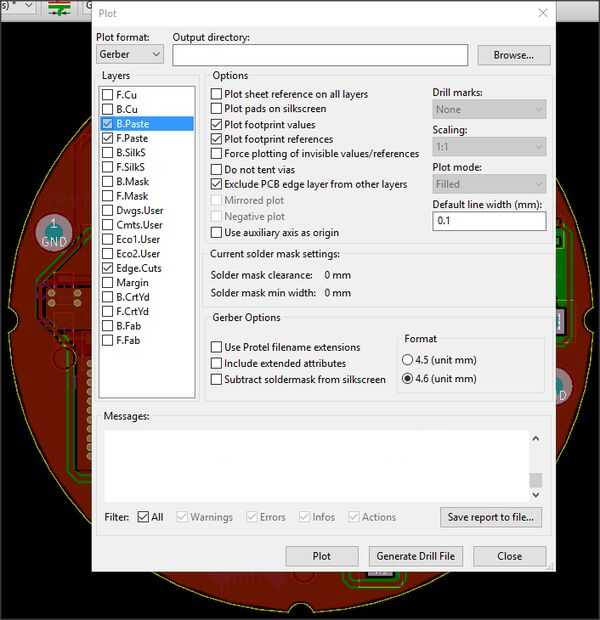 OSHstencils hacer una gran cosa acerca de no incluyendo el borde de la placa cortado en la capa de pasta (probablemente, porque es una pérdida de tiempo del láser y podría hacer más grande que la máscara) yo uso KiCAD para mis diseños, así en el cuadro de diálogo 'plot', usted apenas necesita seleccionar opción 'Borde del PCB excluir de otras capas', y tres archivos gerber separado , uno para cada lado PCB pegar capa y una tercera que contiene los cortes de' borde' como una referencia. Trama de esas capas, carga en gerbview (desde la ventana principal de KiCAD) y comprobar que los datos contienen sólo las capas de pasta de que esperas, sin los cortes de borde. Entrar en OSHstencils, subir los datos y verificación parece correcto en su vista previa de web y hacen su pedido.