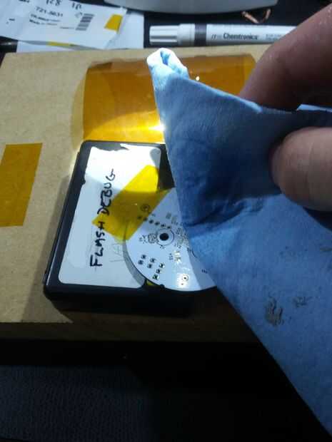 Limpio el PCB con IPA empapado en un trapo (un poco) si tienes un microscopio o una lupa decente, ahora sería ser un buen momento mirar alrededor para cualquier fibras callejeros que puedan interferir con los pads de soldadura.
