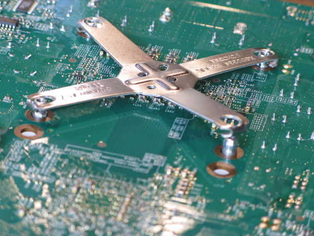 Para reemplazar los disipadores de calor, poner hacia atrás a través de los orificios de la placa madre y trabajar a la inversa. Deslice la abrazadera y presione las "patas" de la X hasta que enganche en los tornillos del disipador de calor. Puede que necesite utilizar un destornillador para apalancar queden abiertas un poco mientras que usted les está empujando hacia abajo.