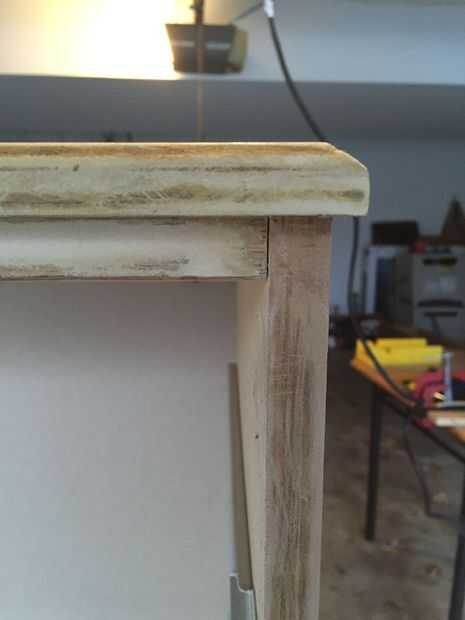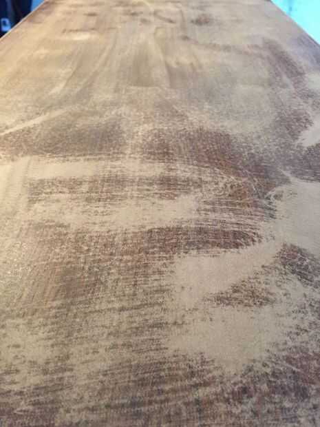 Utilicé la herramienta multi-max de dremel con lija de grano 240 para este proyecto. También usé un bloque de lijado en las zonas donde no podía llegar la dremel. Es importante no a la arena el laminado fuera completamente para exponer el enfasis tablero de partícula. Yo era culpable de esto es algunas áreas donde la dremel estado a larga (ver zonas marrones claras en fotos arriba). Si arena mucho las diferentes superficies (laminado y arpillera) podrían ser distinguibles en el producto acabado.